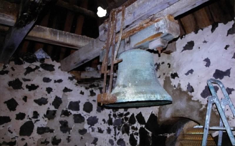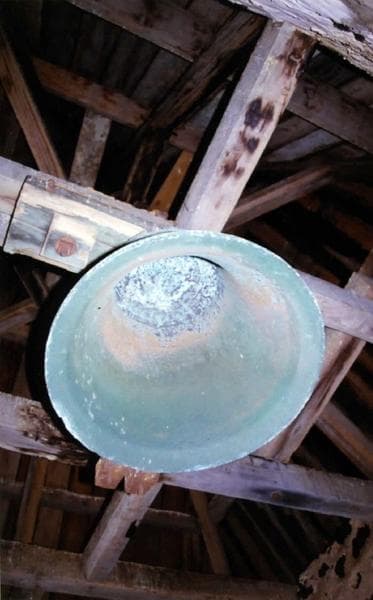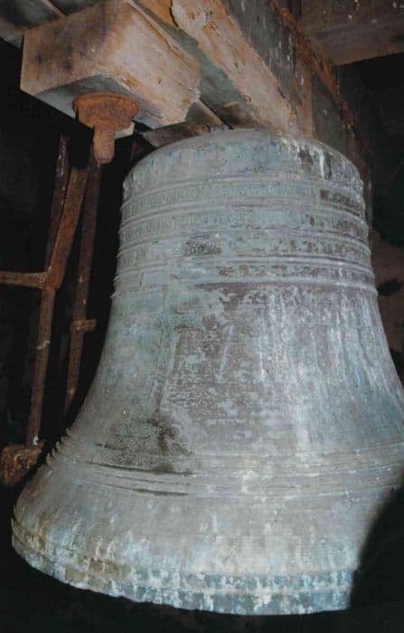 Cloche en bronze avec inscription et décor. Sans battant, ni possibilité d'en accrocher, cette cloche a toujours été actionnée par tintement : deux marteaux de fer sont montés sur le joug de suspension, les anses de la cloche sont intégrées à une demi-poutre boulonnée à une poutre de charpente. Poids = 100 kg environ.