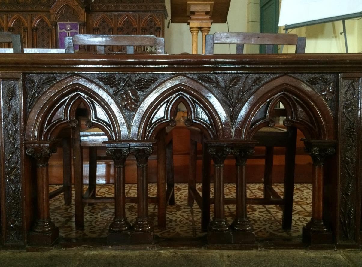En bois de natte et bois d'olive, longue de plus de 17 mètres, elle remplace une première table de communion en fer forgé installée vers 1900 à la livraison de l'église. Elle se subdivise en : - deux travées à quatre arcs en ogives aux extrémités, - et dix travées possédant chacune trois arcs en ogives entre l'autel sainte Thérèse à gauche et l'autel de la Vierge à droite. Les ogives se composent d'un arc principal simplement mouluré surmontant un arc trilobé, modèle inspiré des arcatures de la partie basse de l'autel majeur. Chaque ogive repose sur des colonnes à chapiteaux sculptés de feuillages stylisés. Des écoinçons relient les arcs dans leur partie supérieure. Les travées sont bordées aux extrémités de montants carrés. Une large main de prise moulurée relie l'ensemble des éléments. Le riche décor sculpté, présent uniquement du côté de la nef, s'inspire de celui de l'autel majeur mis en place 16 ans plus tôt. Il se compose d'épis de blé, de grappes de raisins et de feuilles de vigne en bas-relief. Ils alternent sur les écoinçons tandis que les deux plantes symboliques se mêlent sur les montants carrés.