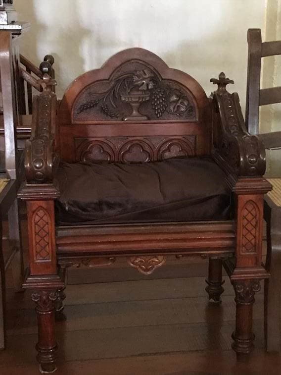 En bois de natte et de forme presque carrée, l'assise est portée par quatre colonnes à chapiteaux sculptés. Elles se prolongent par des montants carrés décorés d'arcs en ogive. Deux larges consoles sculptées forment les accotoirs. Le dossier trilobé est sculpté d'un calice d'épis de blé et d'une grappe de raisin, le tout en relief.