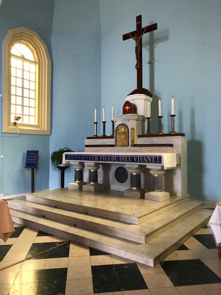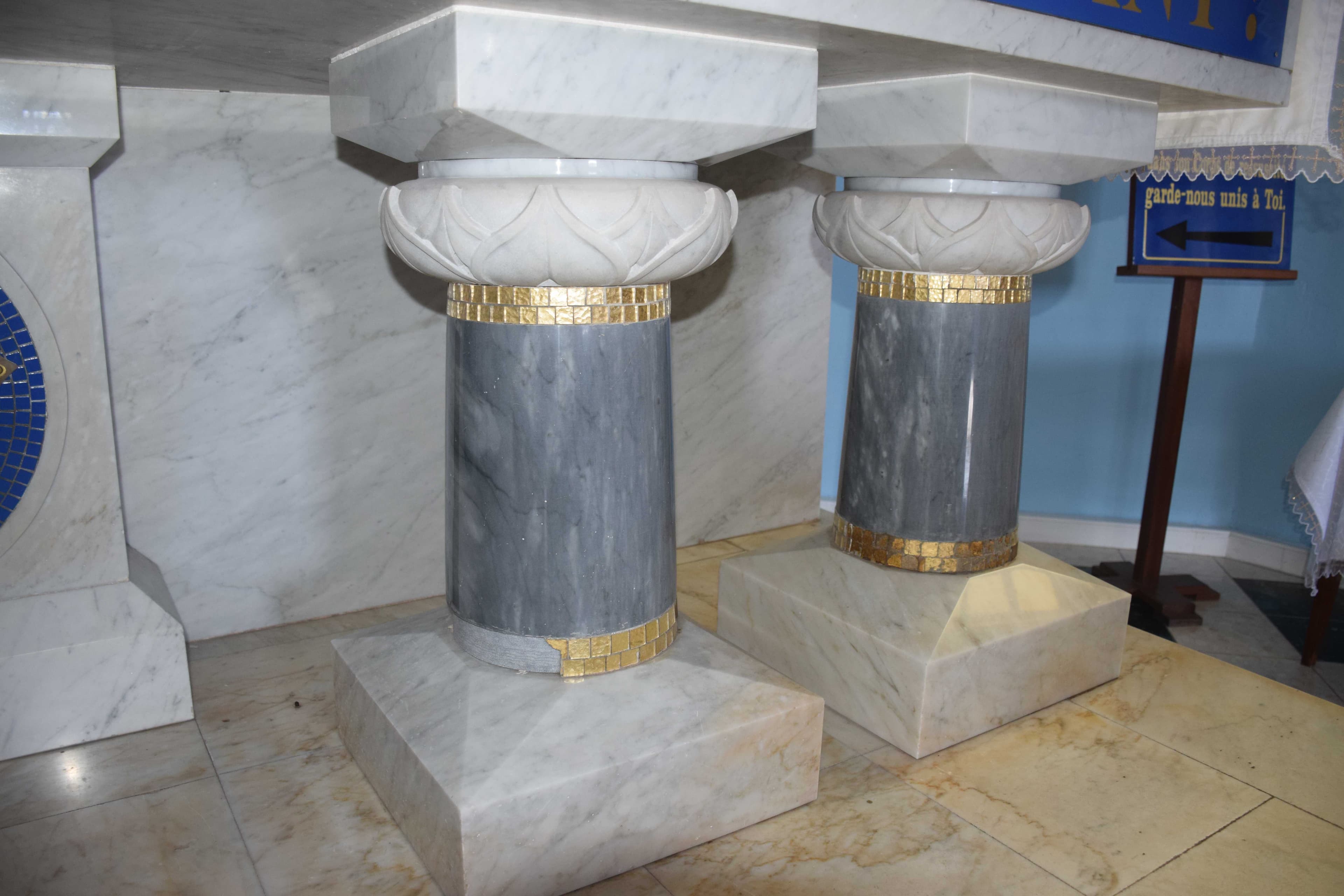 L'ensemble est conçu en béton recouvert de marbre gris clair ; L'autel est posé sur un socle à trois emmarchements. La table d'autel repose sur quatre colonnes en marbre d'un gris plus foncé, soulignées de carreaux de mosaÏques dorés, avec des chapiteaux sculptés de feuilles stylisées. AU centre une mosaïque circulaire sur fond bleu représente le monogramme marial en laiton doré (lettre AM entrelacées). Le tabernacle est fermé d'une plaque en cuivre doré ornée d'une croix. Deux autres plaques dorées figurant des anges stylisés sont appliquées sru les côtés. Ce décor rappelle un style à la jonction des influences Art nouveau et Art déco européennes. L'autel est surmonté de six chandeliers en métal doré, aujourd'hui électrifiés.