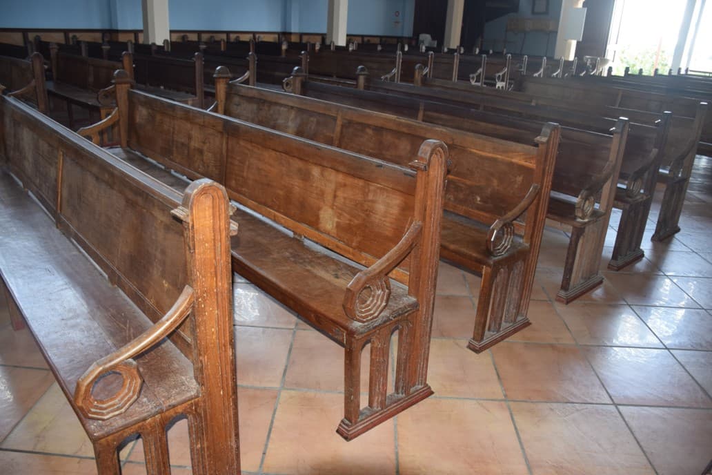 Ils sont réalisés localement en bois de natte. Ils s'intègrent complètement dans le décor de l'église car ils présentent à leurs extrémités un décor à pans coupés identique à celui du front de l'église et de la balustrade de la tribune. Plusieurs bancs sont attaqués par les termites ; de plus certains ont perdu leurs accotoirs.
